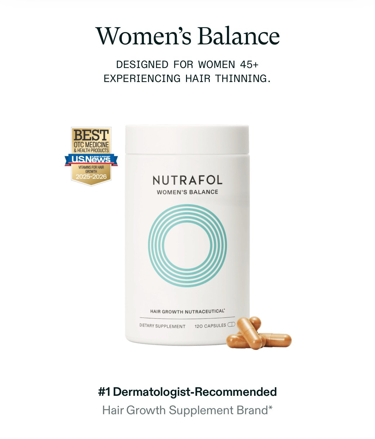Our physician-formulated hair growth supplement is designed for women 18-44 experiencing hair thinning. We use a clinically proven formula and standardized ingredients to target key root causes of thinning, such as stress, lifestyle and nutrition. This award-winning formula supports faster-growing, visibly thicker, fuller, stronger hair. And, it's a seamless addition to your daily wellness routine: just 4 capsules, once a day for results in 3-6 months.